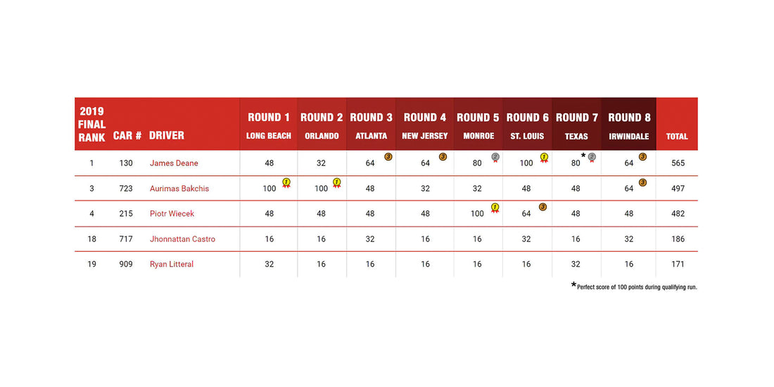 This year's performance from James Deane could only be described as extraordinary. From six podium finishes to a perfect qualifying run in Texas, James proved once again that he is the best drift driver in the game today. He finished again as the first place champion for the third year in a row cementing his legacy in the history books.